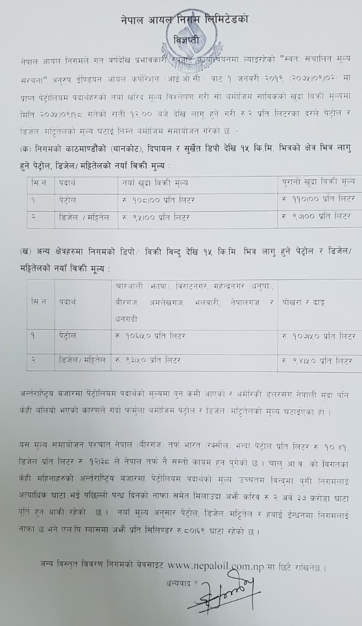 निगमका निर्देशक एवं प्रवक्ता वीरेन्द्र गोइतका अनुसार स्वचालित मूल्य प्रणाली अनुसार पेट्रोल, डिजेल र मट्टितेलमा प्रतिलिटर २ रुपियाँ घटाएको हो ।